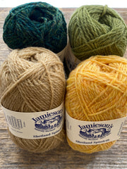 Each kit contains four 25g balls of Jamieson's of Shetland Spindrift and a pattern postcard with a supply list and link to download the Hapkerchief pattern by Gudrun Johnston.